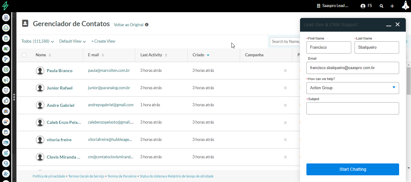 Assim que você enviar sua primeira mensagem no chat, será colocado em uma fila. O suporte da Lead Gen & CRM responderá à sua mensagem inicial assim que possível.