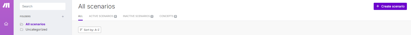 No Make, dentro da seção “Scenarios”, clique no botão + Create scenario (localizado no canto superior direito da tela).
