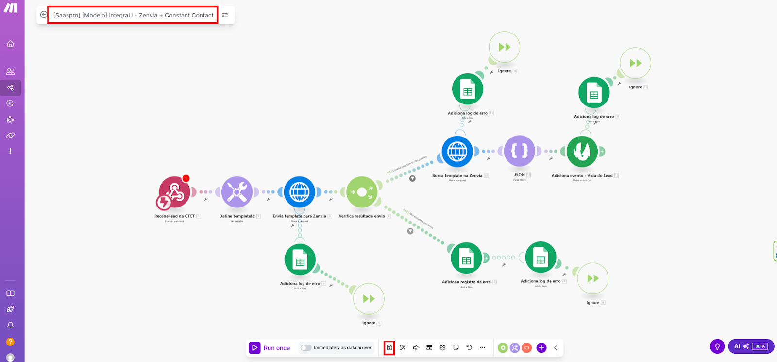Agora, o editor deve mostrar os diferentes módulos do cenário de integração na tela. Antes de iniciar as configurações, clique no ícone Save da barra de ferramentas para garantir que o cenário foi criado: