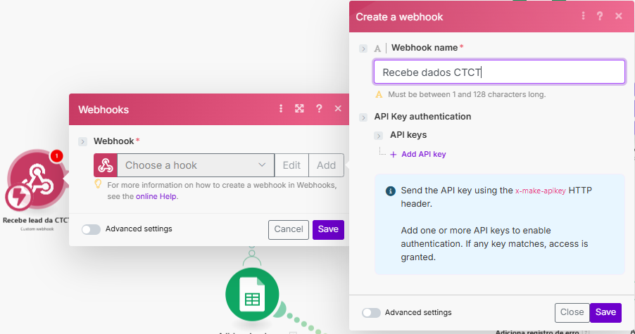 O primeiro módulo a ser configurado é o webhook “Recebe lead da CTCT”. É ele que vai servir como gatilho da integração, recebendo dados dos leads enviados a partir da Constant Contact. Para realizar a configuração, clique com o botão esquerdo em cima do módulo. Uma modal de título “Webhooks” aparece, dentro da qual você seleciona o botão Add para criar um novo webhook. Uma segunda modal será exibida, onde você digita um nome para webhook que está sendo criado, “Recebe dados CTCT” no exemplo abaixo. Clique no botão Save das duas janelas para que o webhook seja criado.