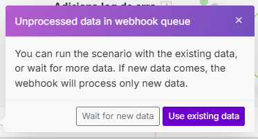 Caso o preenchimento já tenha sido feito, vai aparecer uma janela na tela informando que existem dados numa fila que já podem ser processados. Clique em Use existing data que as informações do lead serão recebidas corretamente pelo webhook: