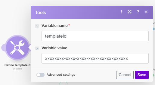 Uma vez criado o gatilho, a partir daqui serão criados os módulos de tarefas. A primeira tarefa é a “Define templateId”, responsável por criar uma variável para armazenar o ID do Template de mensagem - que será utilizado em tarefas posteriores. O ID possui o formato UUID (uma string de caracteres no formato xxxxxxxx-xxxx-xxxx-xxxx-xxxxxxxxxxxx, contendo letras e números) e pode ser encontrado dentro da plataforma da Zenvia. O procedimento é o seguinte: copiar o valor disponibilizado na Zenvia, colar no campo “Variable value” e clicar no botão Save. Mais informações sobre como templates pra Whatsapp na Zenvia estão disponíveis neste artigo.