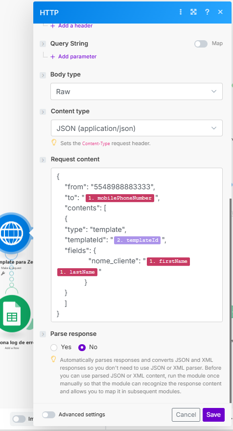 | 3 | HTTP Request | Envia template para Zenvia |