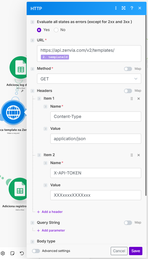 2) Adicionar o token de autorização, na seção de Headers do módulo - propriedade X-API-TOKEN.