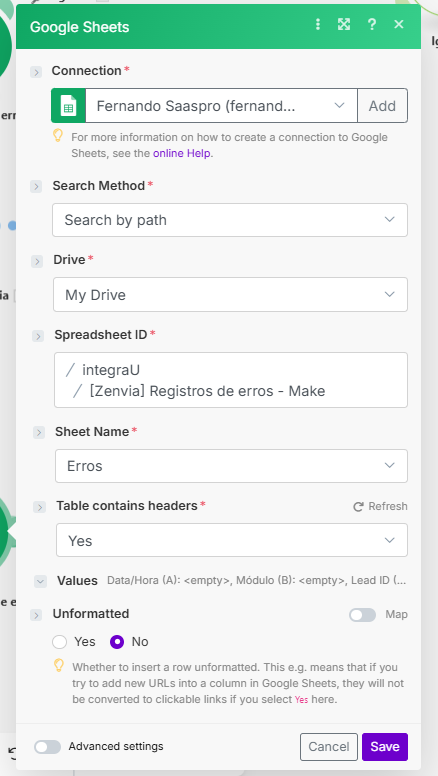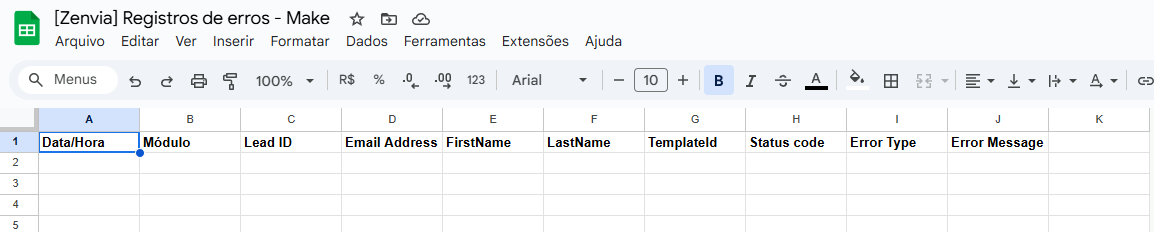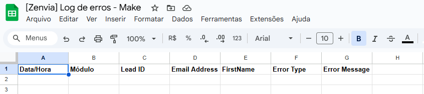 Conexão realizada, uma planilha precisa ser criada no Google Drive da conta que foi conectada, para que o mapeamento das informações que serão registradas possa ser realizado. Neste exemplo, foi criado um arquivo de nome “[Zenvia] Registro de erros - Make”, contendo uma aba chamada “Erros” com as seguintes colunas: