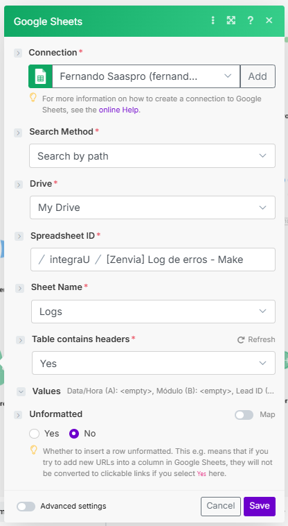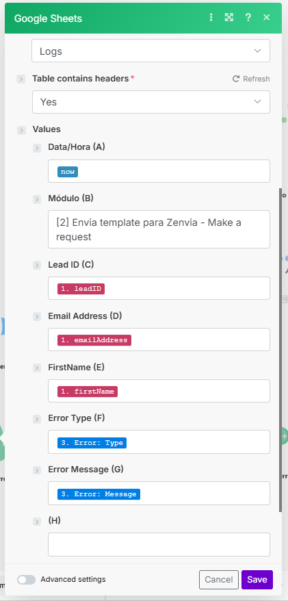 A configuração destes quatro módulos é realizada da mesma maneira. Primeiro, configurando um arquivo no qual os registros serão adicionados. Neste exemplo, foi criado um arquivo de nome “[Zenvia] Log de erros - Make”, contendo uma aba chamada “Logs” com as seguintes colunas: