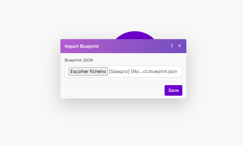 Uma modal será aberta, dentro da qual você pode fazer o upload do arquivo para dentro do Make. Assim que o arquivo que você baixou for selecionado, é preciso clicar em Save para a importação ser realizada: