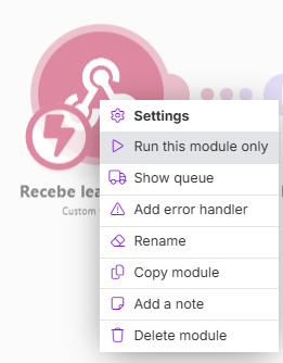 Observação: em alguns dos passos seguintes, pode ser necessário a configuração de valores dinâmicos, ou seja, variáveis que dependem das informações de lead que são recebidas no webhook. Uma forma de gerar valores que possam ser utilizados na configuração de tais variáveis é enviar dados para a URL do webhook recém criado através do preenchimento de formulário em uma Landing Page da Constant Contact, por exemplo. Após o preenchimento, clique com o botão direito sobre o módulo e selecione a opção "Run this module only”: