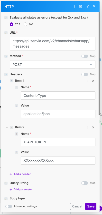 1) adicionar o token de autorização (pode ser encontrado dentro da plataforma da Zenvia), na seção de Headers do módulo. O nome dessa propriedade é X-API-TOKEN;