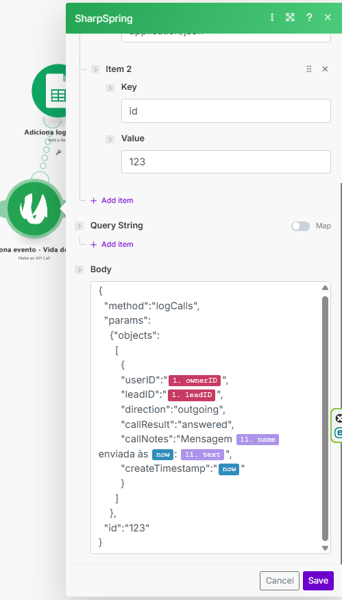 "callNotes":"Mensagem {{11.name}} enviada às {{now}}: {{11.text}}",