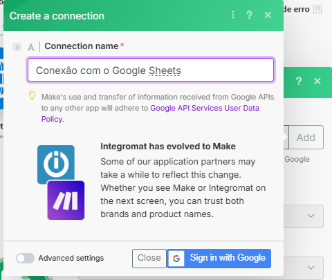 O módulo a ser configurado neste caminho é o “Adiciona registro de erro”, do Google Sheets. Uma conexão com o Sheets precisa ser criada, clicando em Add, registrando um nome e utilizando o login com o Google.